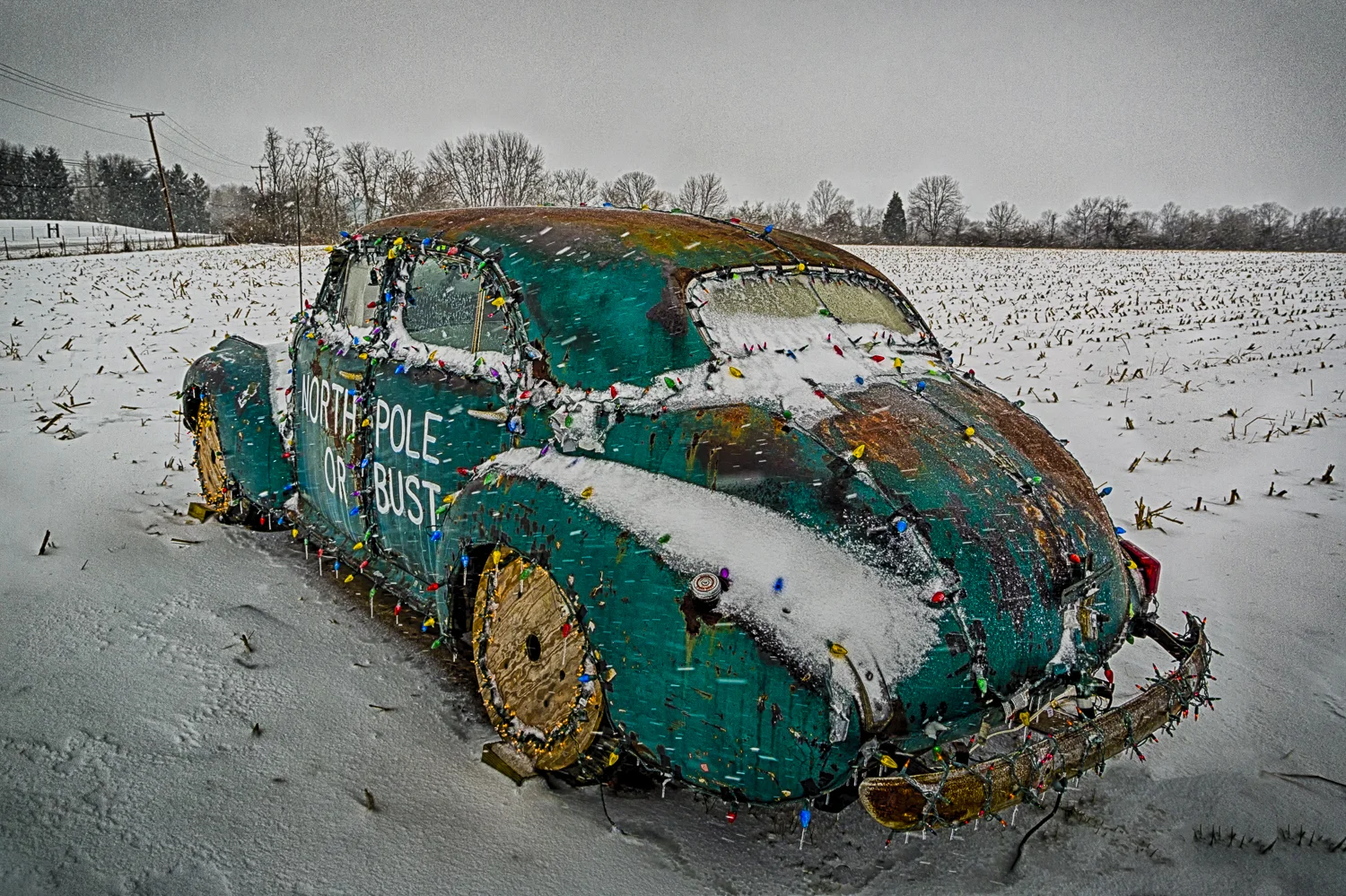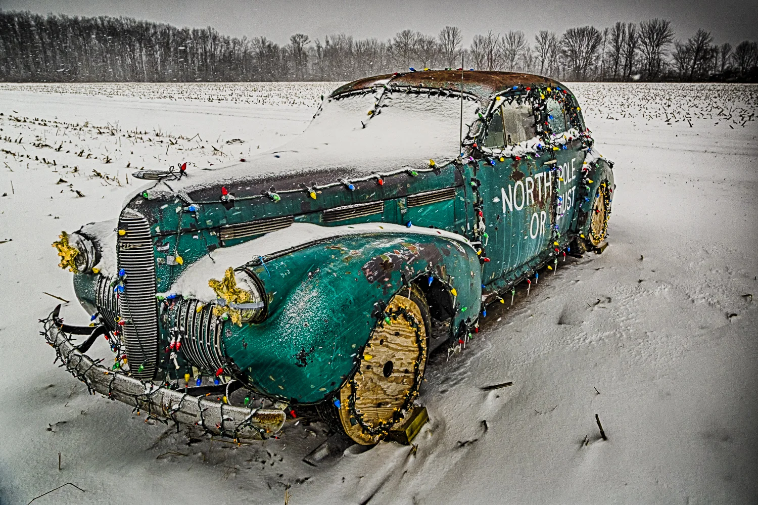 In northern Warren County every Christmas since 2002, this car has intrigued me. But being able to create the image I had envisioned, I needed a snow storm. The day after Christmas in 2012, just as the snow storm started, I left work early and was on my way. The snow was being driven forcefully by the wind that day. The planning and preparation had paid off; I was at the right place, at the right time.