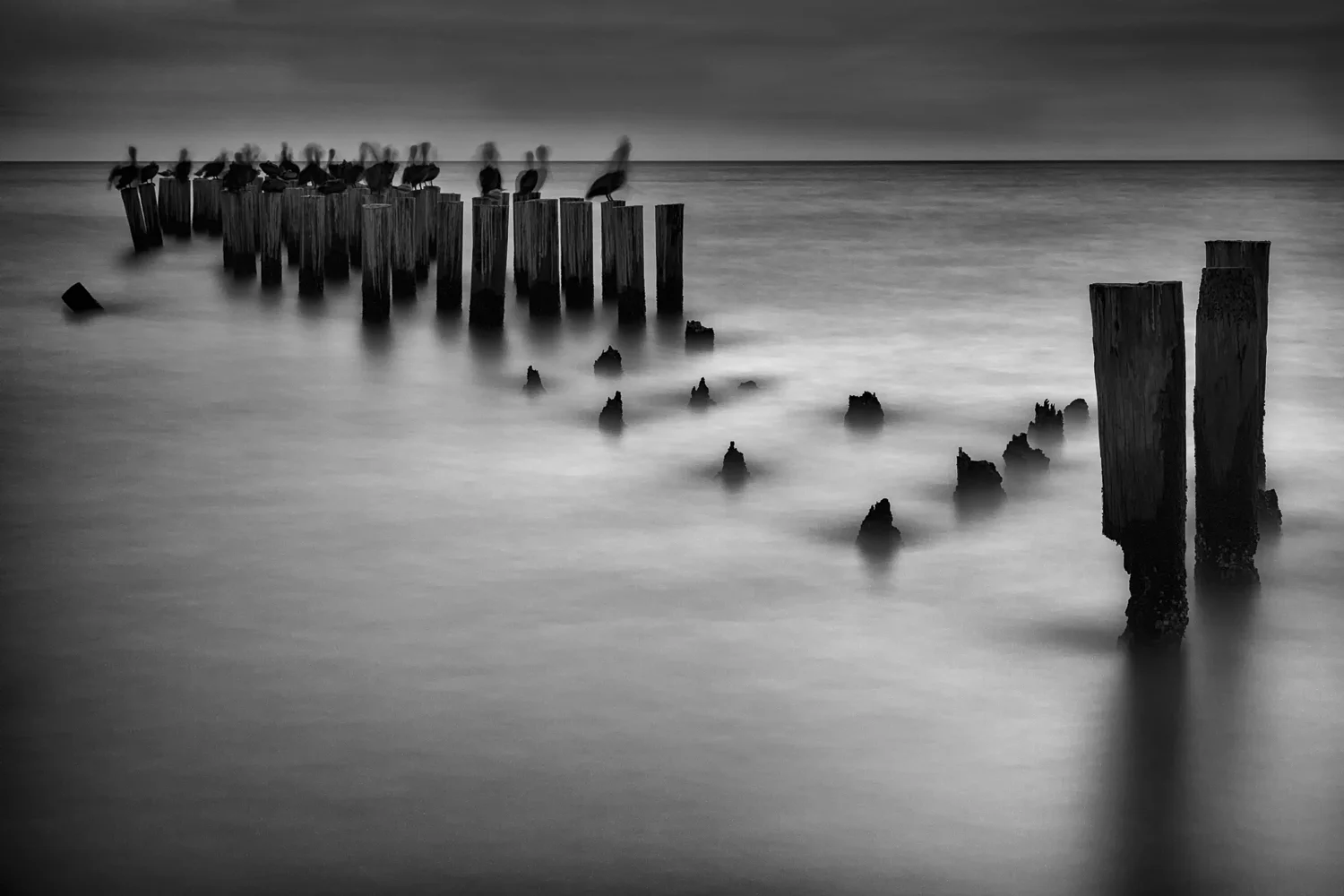 I found this spot while visiting the beach in Naples, Florida one evening. This old pier was a wonderful spot to make some long exposure images, which gives the water its misty or fog like appearance. You can actually see the patterns in the waves due to their cyclic progression. You will also see the birds moving, which reminded me of a group of friends or co-workers sitting at tables and talking about their day.
