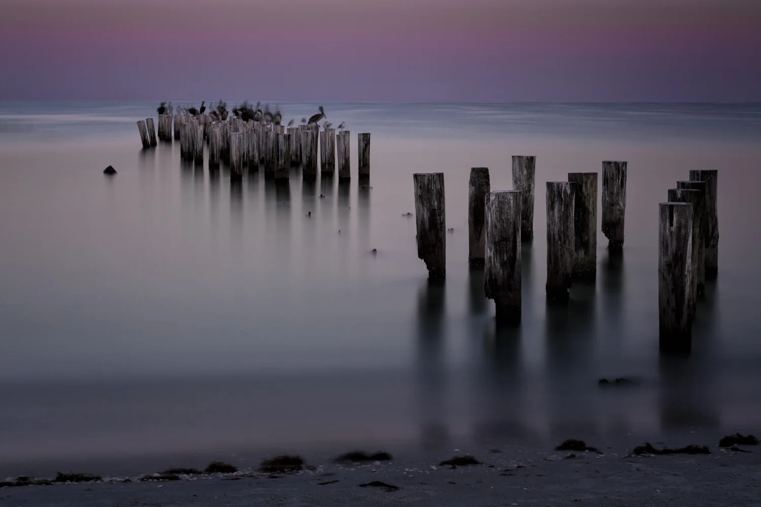 Returning to this pier on the beach in Naples the following morning I found amazing muted purples and blues, with only a hint of the morning sun reflecting on the water and in the sky. I had to make another image showing the early morning sky as the sun started to rise behind me illuminating the remnants of the old pier.